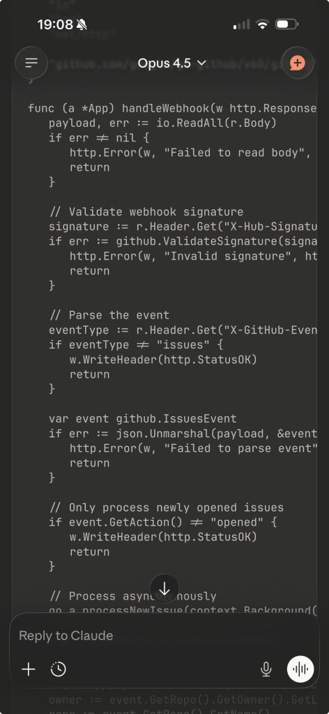 I enjoy reading code on my phone too. It’s like reading a custom tutorial post. Now I know how to handle GitHub webhooks with Go. Even without syntax highlighting I understand what’s going on.